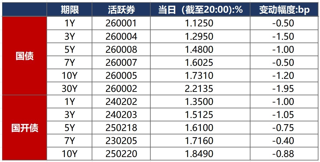 4月22日,多头情绪延续,债市持续走强。截至北京时间20:00,10年期国债活跃券260005收益率下行1.20bp至1.7310%,10年期国开债活跃券250220收益率下行0.88bp至1.8490%。