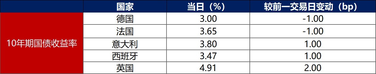 4月22日,主要欧洲经济体10年期国债收益率走势分化。其中,德国10年期国债收益率下行1bp至3.00%,法国10年期国债收益率下行1bp,意大利、西班牙、英国10年期国债收益率分别上行1bp、1bp和2bp。